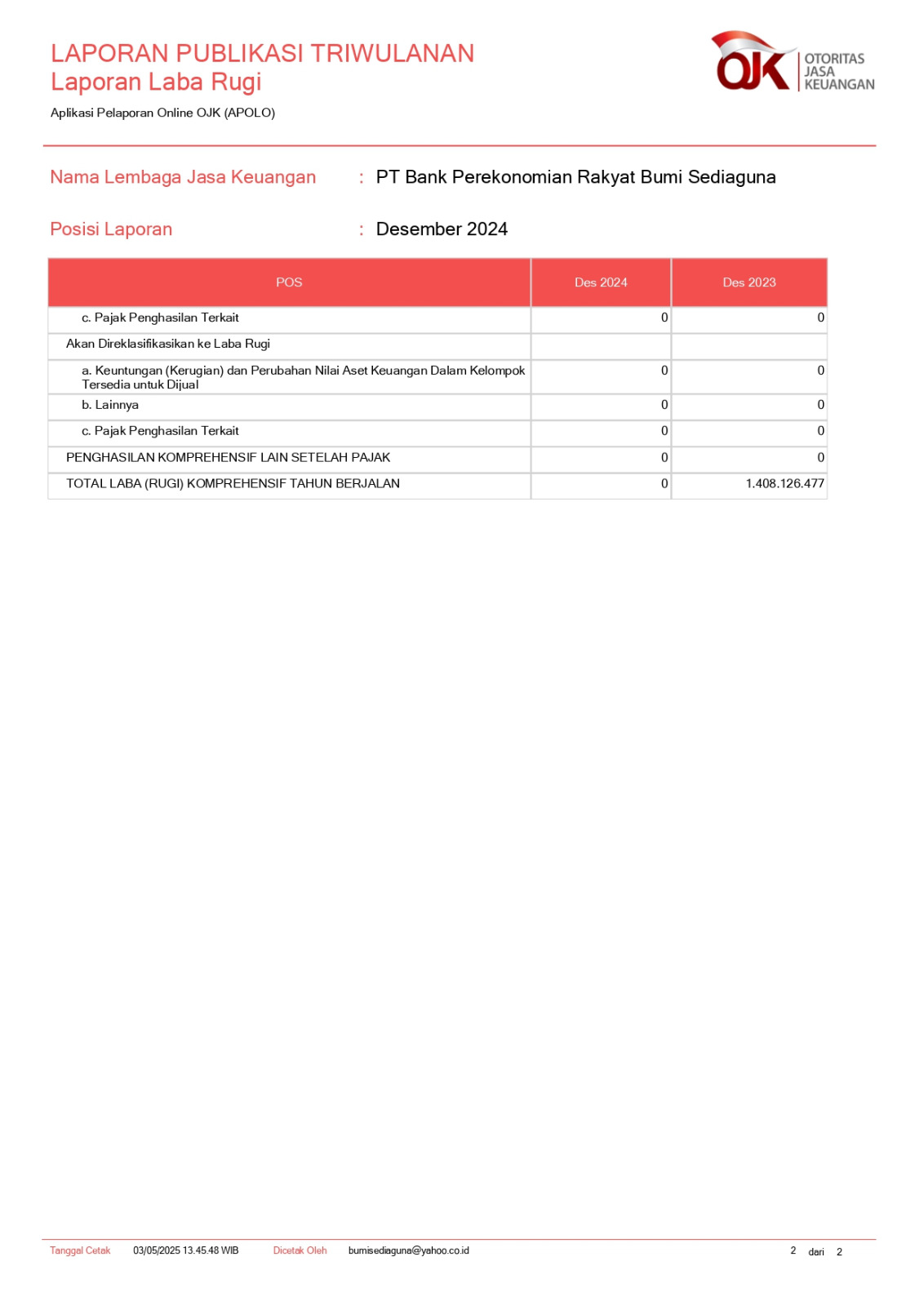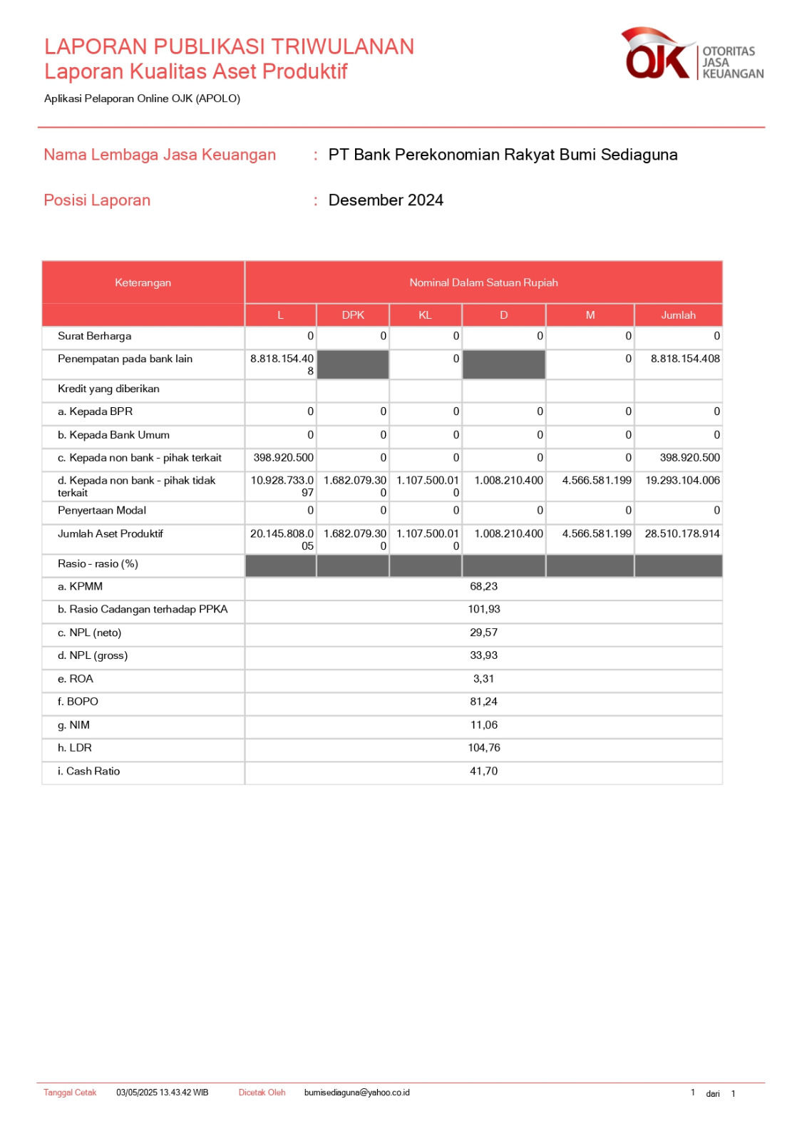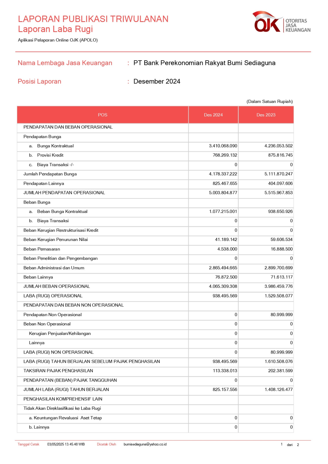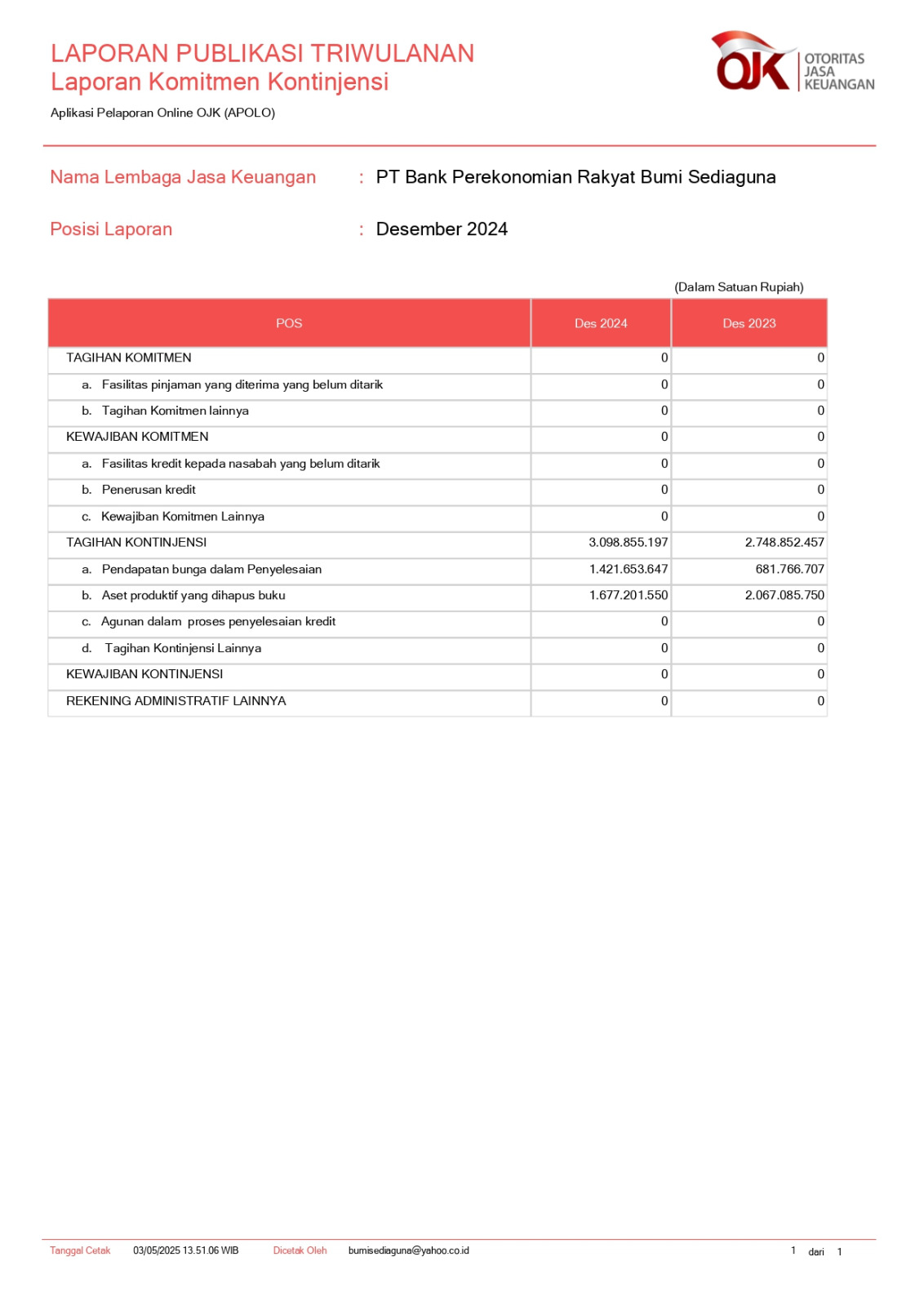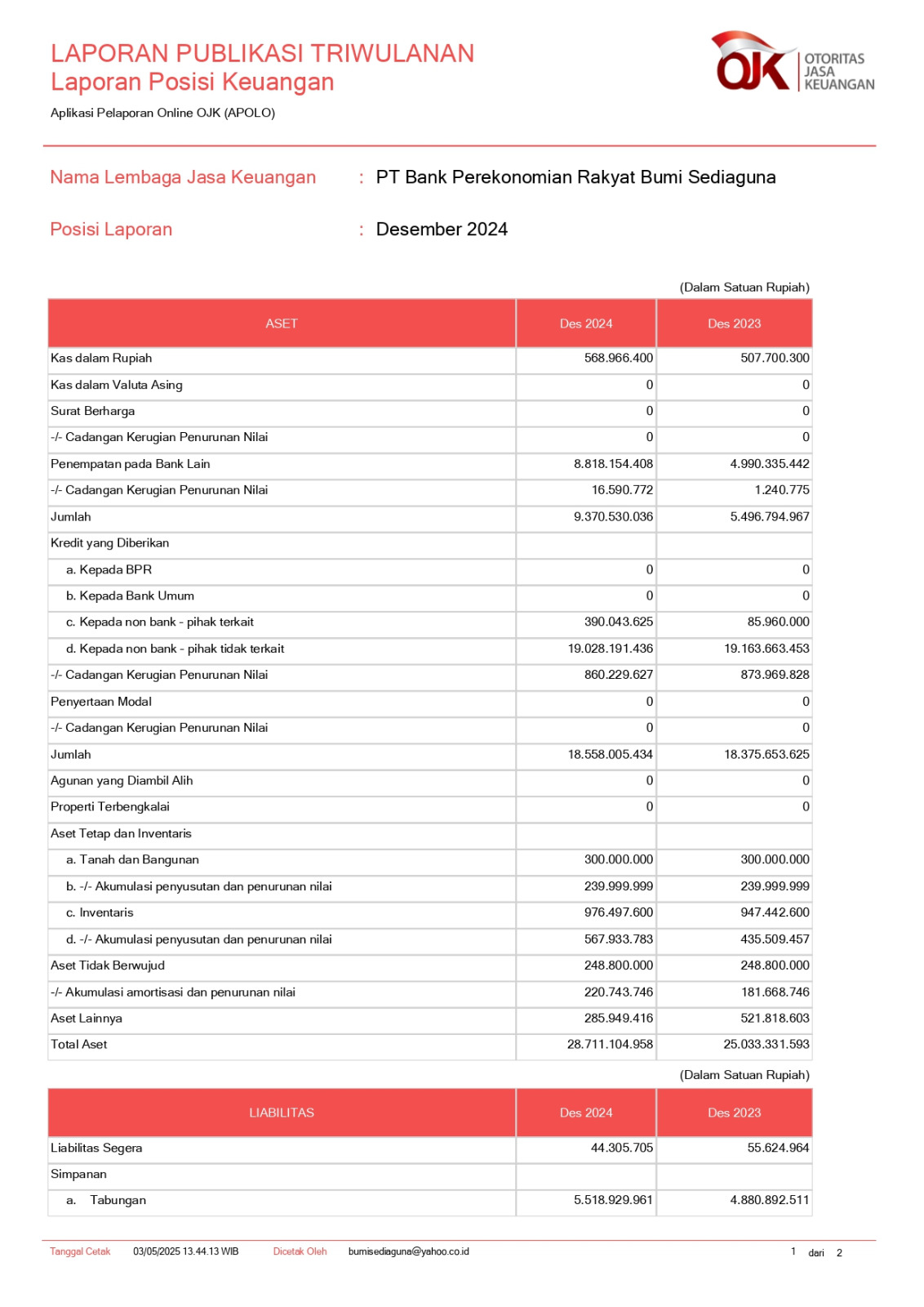 Laporan Publikasi Desember 2024 Laporan Publikasi BPR Bumi Sediaguna untuk bulan Desember 2024 akan menyajikan informasi penting mengenai kinerja keuangan dan kegiatan operasional bank selama tahun tersebut. Laporan ini bertujuan untuk memberikan transparansi kepada nasabah dan pemangku kepentingan mengenai perkembangan dan pencapaian yang telah diraih.